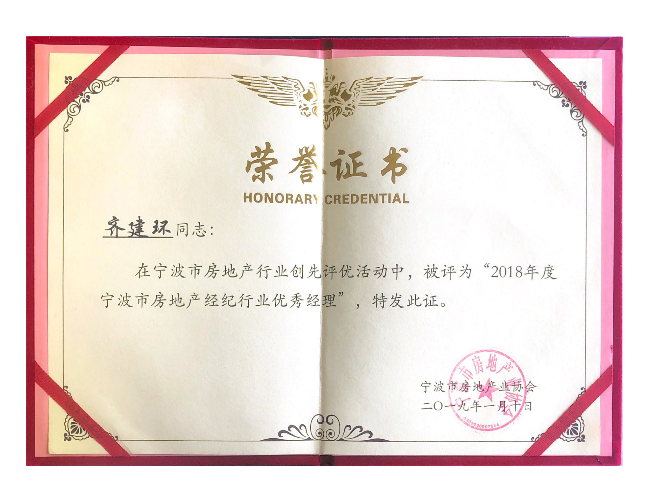 齊建環(huán)先生榮獲2018年度寧波市房地產(chǎn)經(jīng)紀(jì)行業(yè)優(yōu)秀經(jīng)理